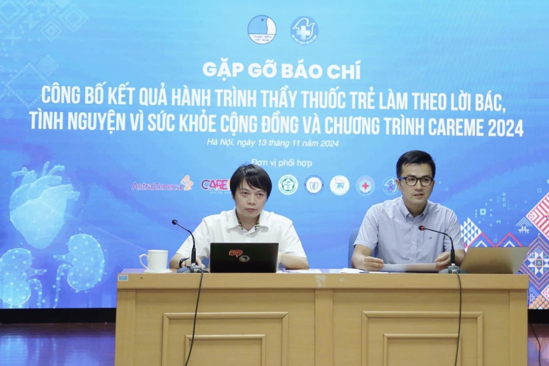 Chiều ngày 13/11, Trung ương Hội Liên hiệp Thanh niên Việt Nam và Hội Thầy thuốc trẻ Việt Nam đã tổ chức gặp gỡ báo chí công bố kết quả Hành trình Thầy thuốc trẻ làm theo lời bác, tình nguyện vì sức khỏe cộng đồng và Chương trình CAREME 2024.